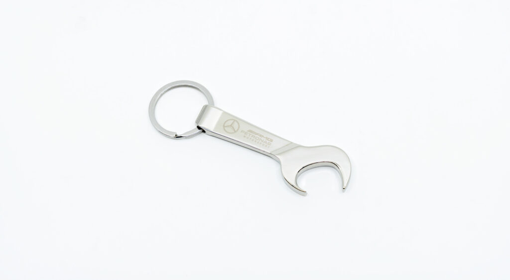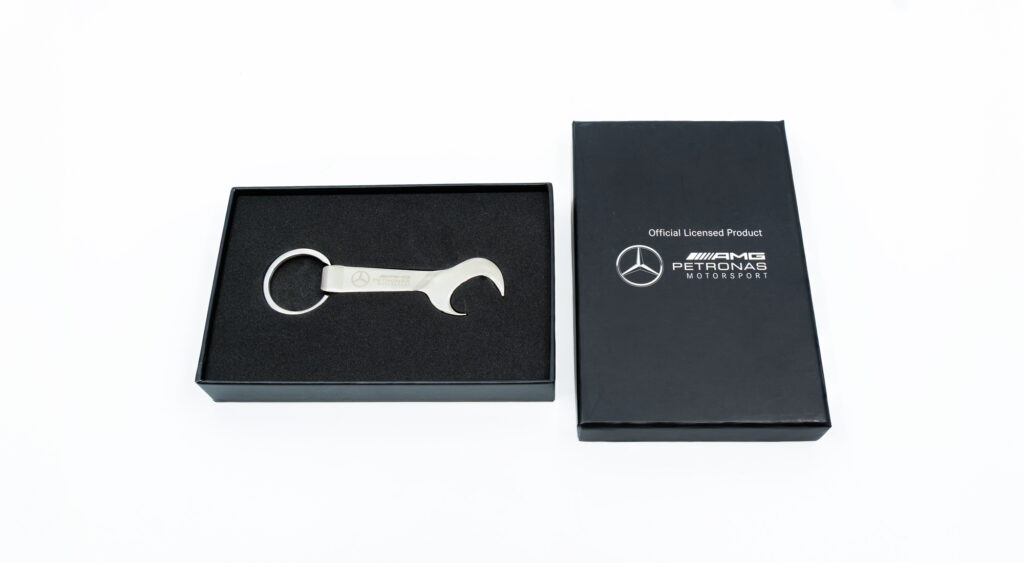 High-quality metal keychain with Mercedes-Benz and AMG Petronas Motorsport logo.